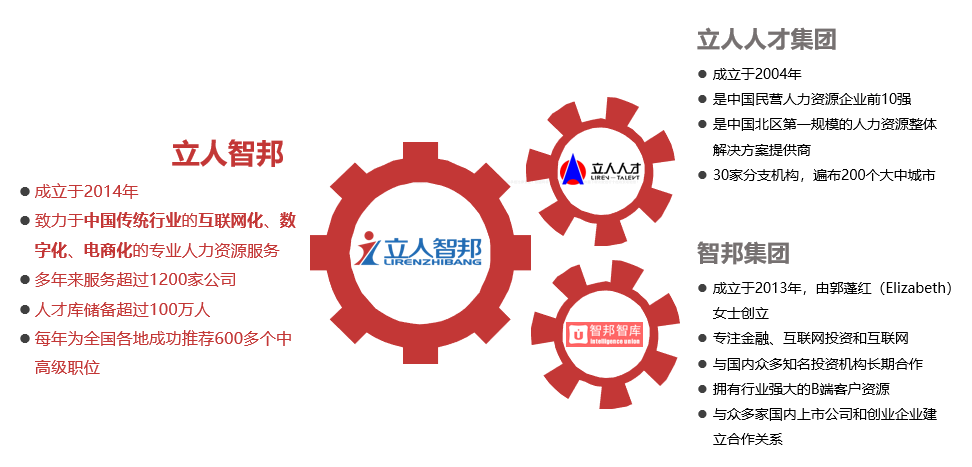 立人智邦成立于2014年,是由立人人才集團(tuán)與智邦人力集團(tuán)強(qiáng)強(qiáng)聯(lián)手共同組建,這兩家公司在業(yè)內(nèi)都具有十余年獵頭經(jīng)驗(yàn)的著名獵頭公司。立人人才集團(tuán)成立于2004年,是中國(guó)民營(yíng)人力資源企業(yè)前10強(qiáng),也是中國(guó)北區(qū)第一規(guī)模的人力資源整體解決方案提供商。立人人才集團(tuán)擁有30家分支機(jī)構(gòu),遍布200個(gè)大中城市。立人人才集團(tuán)組織架構(gòu)為事業(yè)部制,外包事業(yè)部、獵頭事業(yè)部(立人智邦)、管理咨詢事業(yè)部、互聯(lián)網(wǎng)+事業(yè)部。智邦集團(tuán)成立于2013年,由郭蓬紅(Elizabeth)女士創(chuàng)立,在創(chuàng)業(yè)初期以專(zhuān)注互聯(lián)網(wǎng)投資和互聯(lián)網(wǎng)被投企業(yè)提供人才服務(wù)為主線,同時(shí) 探索二三級(jí)城市傳統(tǒng)行業(yè)為輔線。智邦集團(tuán)與國(guó)內(nèi)眾多知名投資機(jī)構(gòu)長(zhǎng)期合作,擁有行業(yè)強(qiáng)大的B端客戶資源。目前已與眾多家國(guó)內(nèi)上市公司和創(chuàng)業(yè) 企業(yè)建立合作關(guān)系,并成就了優(yōu)秀人才的職業(yè)發(fā)展。